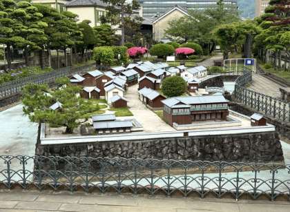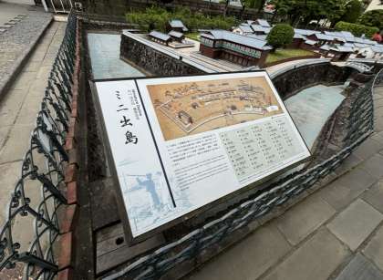 長崎市内散策の班別研修がスタートしました。昼食やお土産を買いながら、各チェックポイントをまわります。ホームページ担当は、ミニ出島に先回りしました。各班が到着するのを待っています。