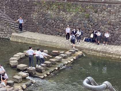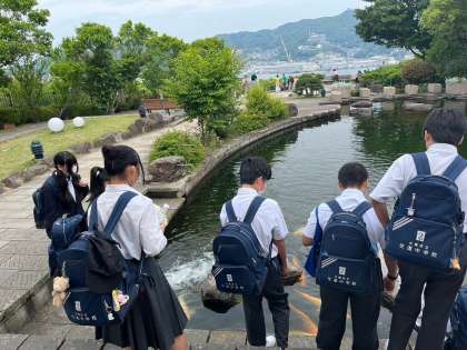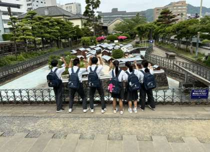 班別研修をすすめています。グラバー園、中華街、ミニ出島、眼鏡橋の各ポイントで担当の先生からチェックを受けます。