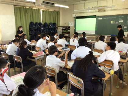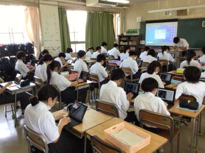 数学・技術・英語の授業です。技術では、本日配布したタブレットを使用してタイピングをしていました。