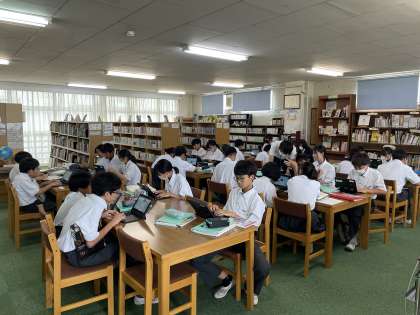 理科と体育の様子です。理科では図書館を利用して調べ学習をしていました。