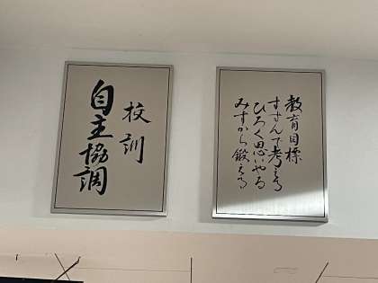 正面玄関に教育目標と校訓のプレートが設置されました。来校された際、ご覧ください。また、校章のプレートも設置されました。