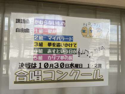 1年生のフロアでは、障がい理解学習のまとめが掲示されています。また、10月に行われる合唱コンクールの自由曲が決定したので、掲示されていました。