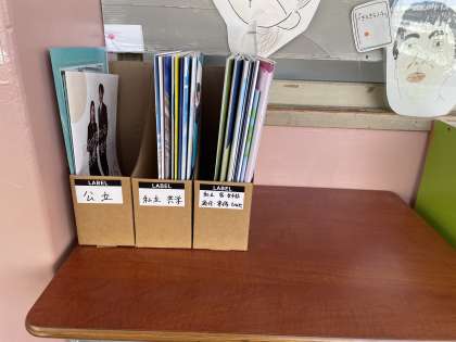 国語の様子です。説明文の内容を表で整理していました。また学年職員室前には、高校のパンフレットが置かれていました。目を通してみよう。