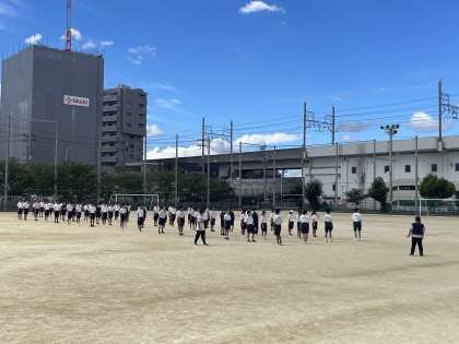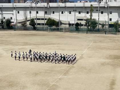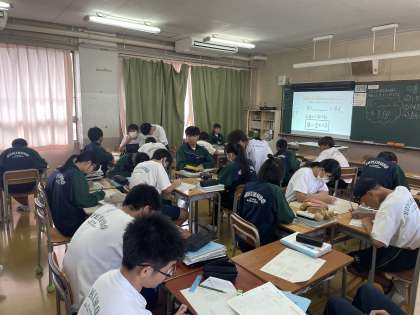 体育と数学の様子です。体育では、校歌とラジオ体操の練習をしていました。学年の先生も、生徒に混ざって校歌を歌っていました。