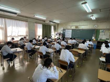 静かな中に、ペンを走らせる音が聞こえます。明日も2教科あります。頑張りましょう!