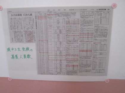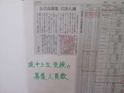 1年生のフロアには、現中3生の公立高校の募集人員が書かれた記事が掲示されていました。