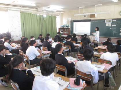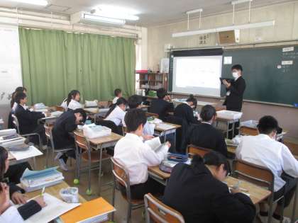 英語A・数学です。英語Aでは、デジタル教科書を使って、発音練習をしていました。
