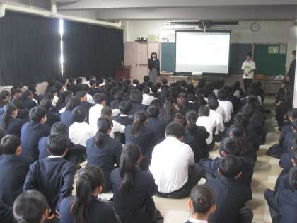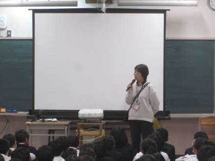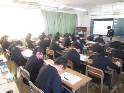 1年生では、生徒総会にむけての取り組みが始まりました。生徒総会を初めて迎える1年生は、生徒総会とは何かの説明のあと、生徒総会が始まった当初におられた先生からのお話もありました。そのあと、教室に戻って意見文を書きました。静かな雰囲気で取り組んでいます。