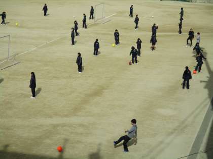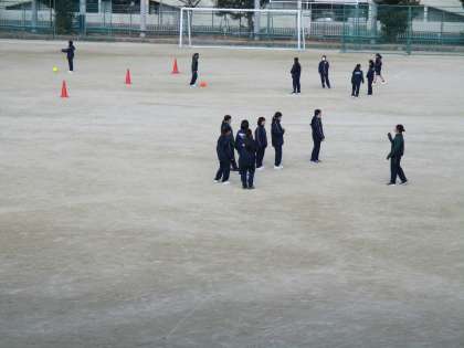 女子はサッカー・男子はマット運動をしていました。女子のサッカーでは、サッカー経験のある学年の先生も授業に参加していました。