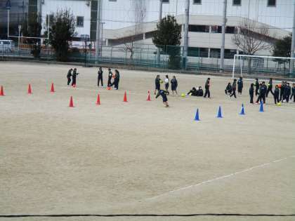 体育です。女子のサッカーでは、コーンをおいてドリブルの練習をしていました。