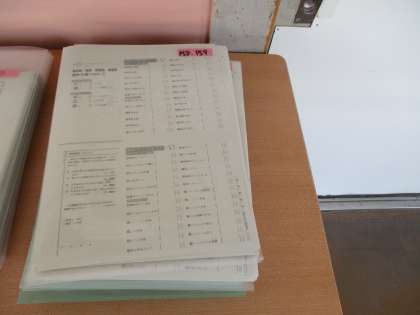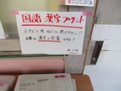 1年生の学年職員室前には、国語の漢字プリントが家庭学習用に置かれていました。家で学習するきっかけに使ってください。小テストやりますよ!
