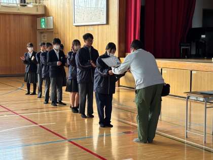 先週行われた、百人一首大会の表彰を行いました。どのクラスも僅差でした。クラス、個人、生活班の部で表彰を行いました。