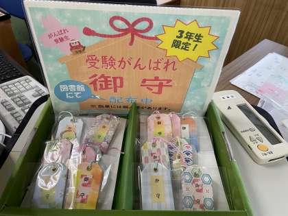 3年生限定で、「受験がんばれ御守」の企画が実施中です。また、司書の先生が定期的に、紹介本を入れ替えてくれています。