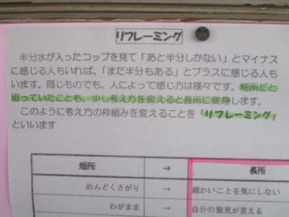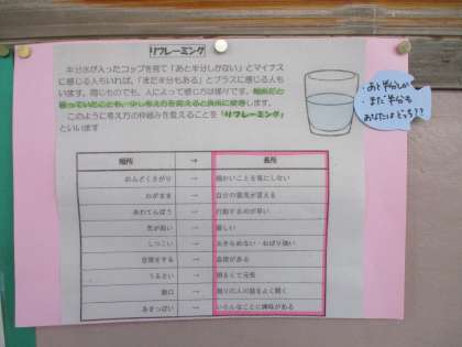 通級指導教室担当の先生が、作成して掲示してくださっています。「リフレーミング」について書かれています。