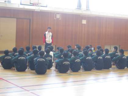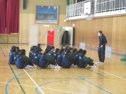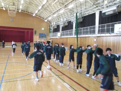 このクラスは、中学校生活最後の体育の授業でした。体育委員が企画した内容の授業を行ないました。最後には、この1年間お世話になった授業担当の先生からのお話もありました。