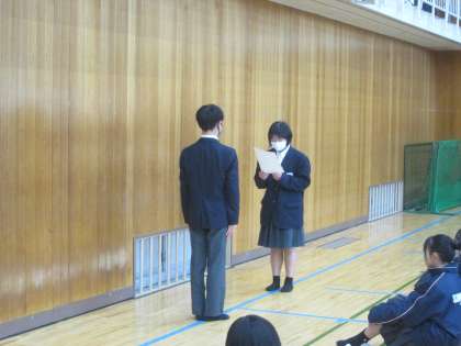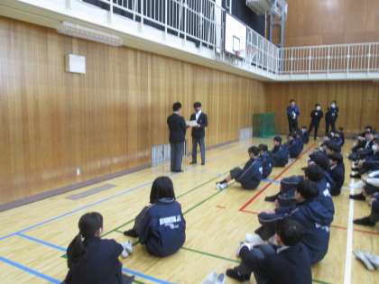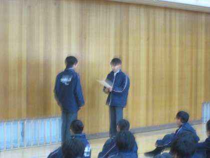 1年生が残って、委員会企画の表彰をしていました。給食企画・号令コンクール・美化企画です。