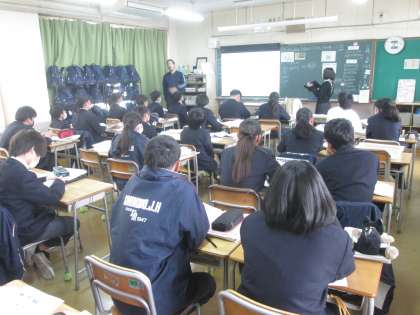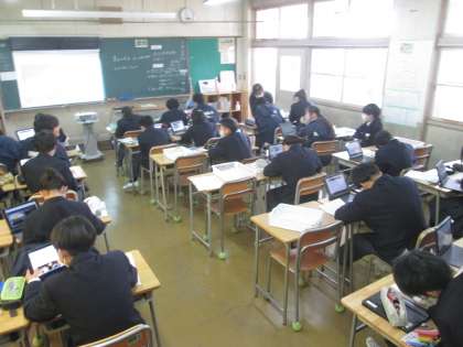 英語Aと家庭科です。家庭科では郷土新聞づくりが進められていました。