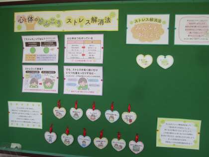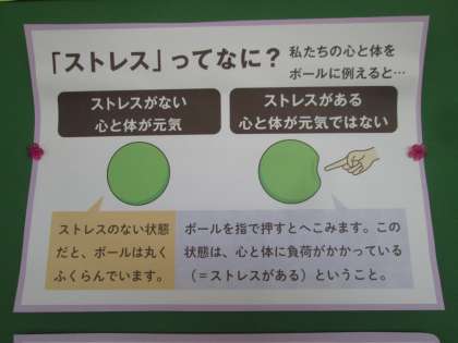 今月は「ストレス」についてです。ストレス解消法の一例が記されていました。みなさんのストレス解消は何ですか??