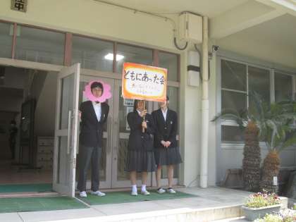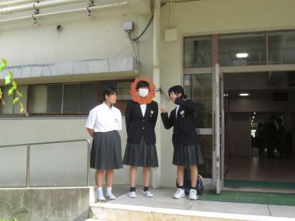今日も朝から、生徒会役員が挨拶運動をしていました。先日の集会で使用した小道具も一緒です!