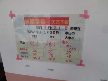 2年生の学職前です。来週の林間で行く、ハチ高原の気温と天気が書かれた掲示物がありました。