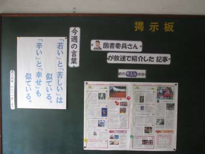 また中央階段には、司書の先生が、お昼の放送での記事を掲示してくださっています。