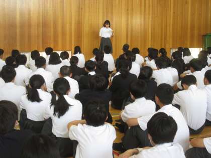朝礼後、2年生は体育館に残り、林間実行委員長から林間学舎の目標が発表されました。