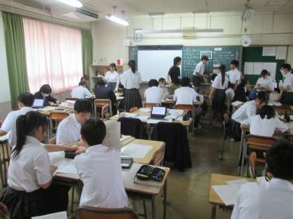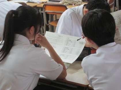 理科です。理科でも学びあいが出来ています。一生懸命です。