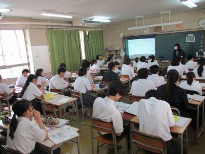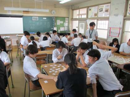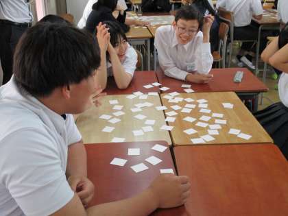 数学と英語です。数学では、学習した内容をカードを使ってゲーム形式で振り返っていました。みんな一生懸命です。