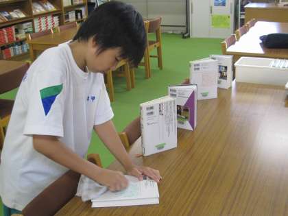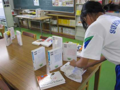 放課後の図書委員は「図書室を気持よく使ってもらう」ための地味な作業をもくもくとしています。そのひとつが固く絞った布で本を拭くこと。けっこう力をこめて拭いています。一日で一段がやっとです。完全に乾いてから棚に戻します。