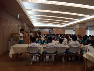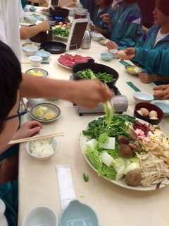 食事係の挨拶の後、すき焼きの美味しい作り方を、教えていただき、がんばってみんなで作っています。
