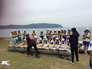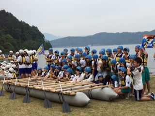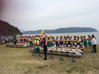 ライフジャケットや、ヘルメットをして、いかだの前でクラス写真を撮ったり、説明を受けました。