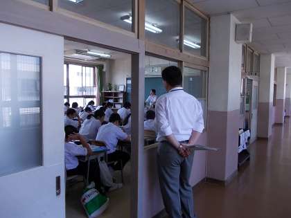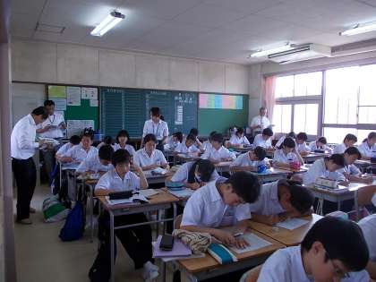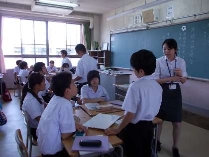 アドバイザーの西先生を迎えて、武元先生の授業の見学と助言が行われています。今日の授業は「書く 原稿用紙の使い方」で、実際に原稿用紙を使い自分の意見を文章にしていました。