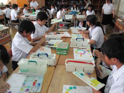 1時間目の美術と英語(少人数)の授業風景です。昨日に続き今日も大変暑い中、頑張っています。