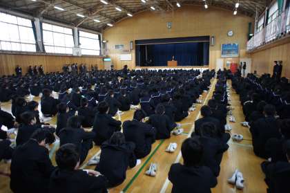 今年度初めて全校生徒598名が集まり、1学期始業式が行われました。