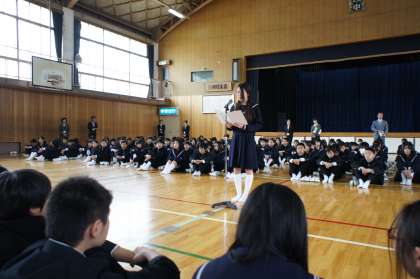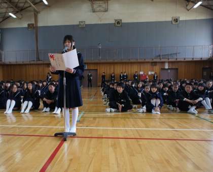生徒会長から新入生に対して歓迎、励ましの言葉が、そして新入生代表生徒から中学生活を頑張る決意、「よろしくお願いします」とあいさつがありました。