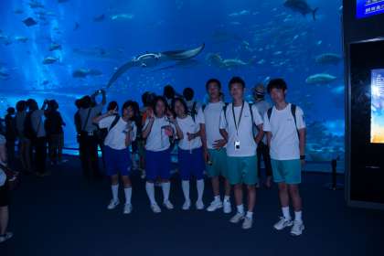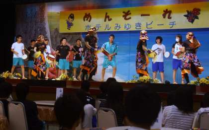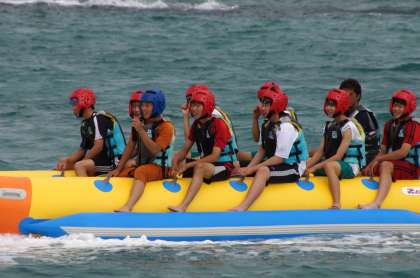 写真は(上)マリン体験・(中)美ら海水族館・(下)エイサー体験の様子です。