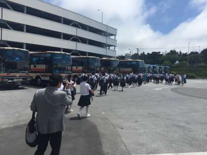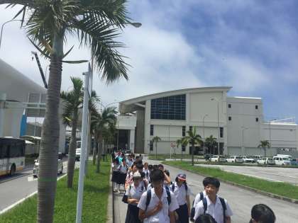 空港から、バスまで歩いています。口々に暑いと言っています。