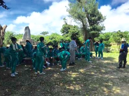 壕の中へ入った後、出てきたところのベンチに座って沖縄戦の話を聞きました。足元が少し汚れました。
