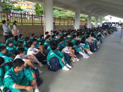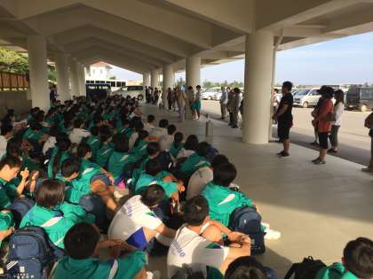 民泊の入村式が伊江港で行われています。現在は、伊江島の民家さん代表の方からの挨拶が行われています。