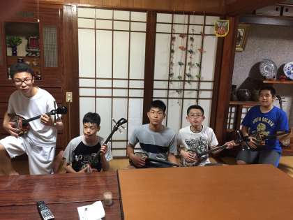 民家さんにお邪魔しました。すると、三線の練習をしていました。1時間で弾けるようになるかな?