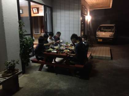 続いて訪問した民家さんでは、お風呂に入って、外でご飯を食べようとしているところでした。タコライス、お刺身、ジャガイモもち、ゴーヤチャンプルーなど、みんなで楽しい夕食を楽しんでいました。