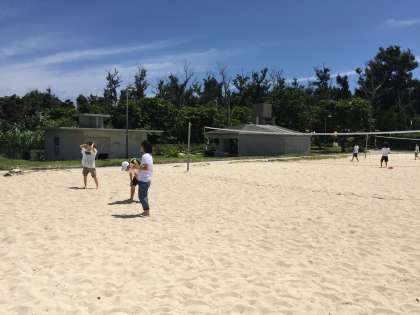 伊江ビーチにきております。まるで真夏のような天気です。ビーチバレーや海辺で楽しんでいます。