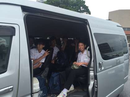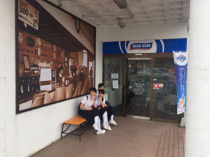 沖縄でお馴染みのブルーシールアイスの本店でアイスを食べている生徒を発見しました。