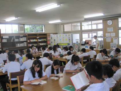 写真は上から3年生(数学)・2年生(英語)・1年生(国語・図書室)の授業風景です。