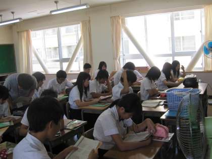 3年英語の分割教室は美術室などと同様エアコンが入っていませんが、扇風機の風を受けながら集中して学習に取り組めています。
