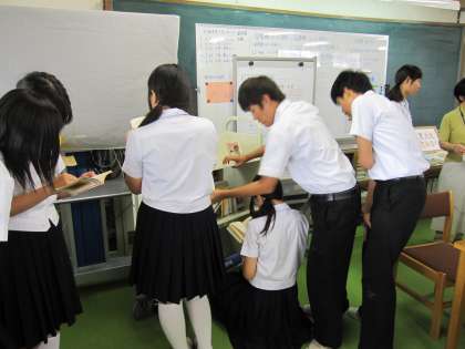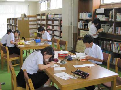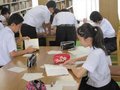 3年生が「名作の冒頭を調べる」授業に来ました。夏目漱石や森鴎外、川端康成の名作を実際に手にとって、その冒頭を書き出すというもので、中には百人一首の課題もありました。残り時間には夏休みの読書用に本を借りた人もいました。時間の関係で授業が取れなかったクラスの人もぜひ、借りに来てください。