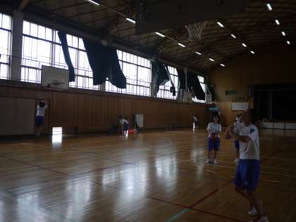 そんな中、体育館では午前中はバレーボール部が、午後は女子バスケットボール部だけが練習に励んでいました。写真は参加部員が少なく、2〜3人で一つのゴールを使ってシュート練習をしているバスケットボール部です。