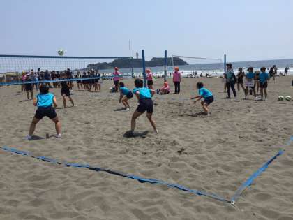 湘南の鵠沼海岸で行われました全国中学生ビーチバレー大会予選に本校バレーボール部が登場しました。得意の粘りで見事にどちらも勝利し、予選を1位通過しています。