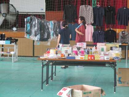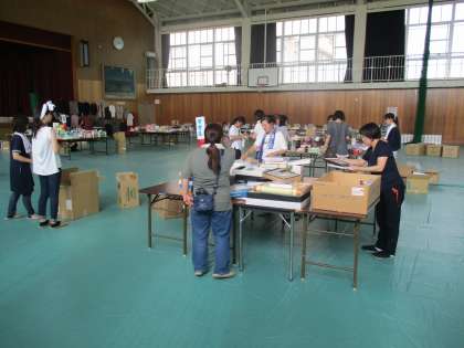 明日のバザーの準備をPTAの皆さんでしていただいています。体育館内は扇風機を回していますがとても暑く作業も大変です。ありがとうございます。