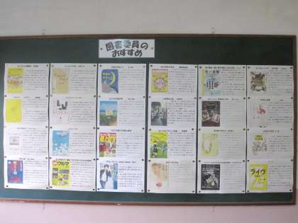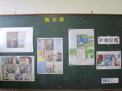 掲示板や図書室だよりで新着図書の紹介がされています。
